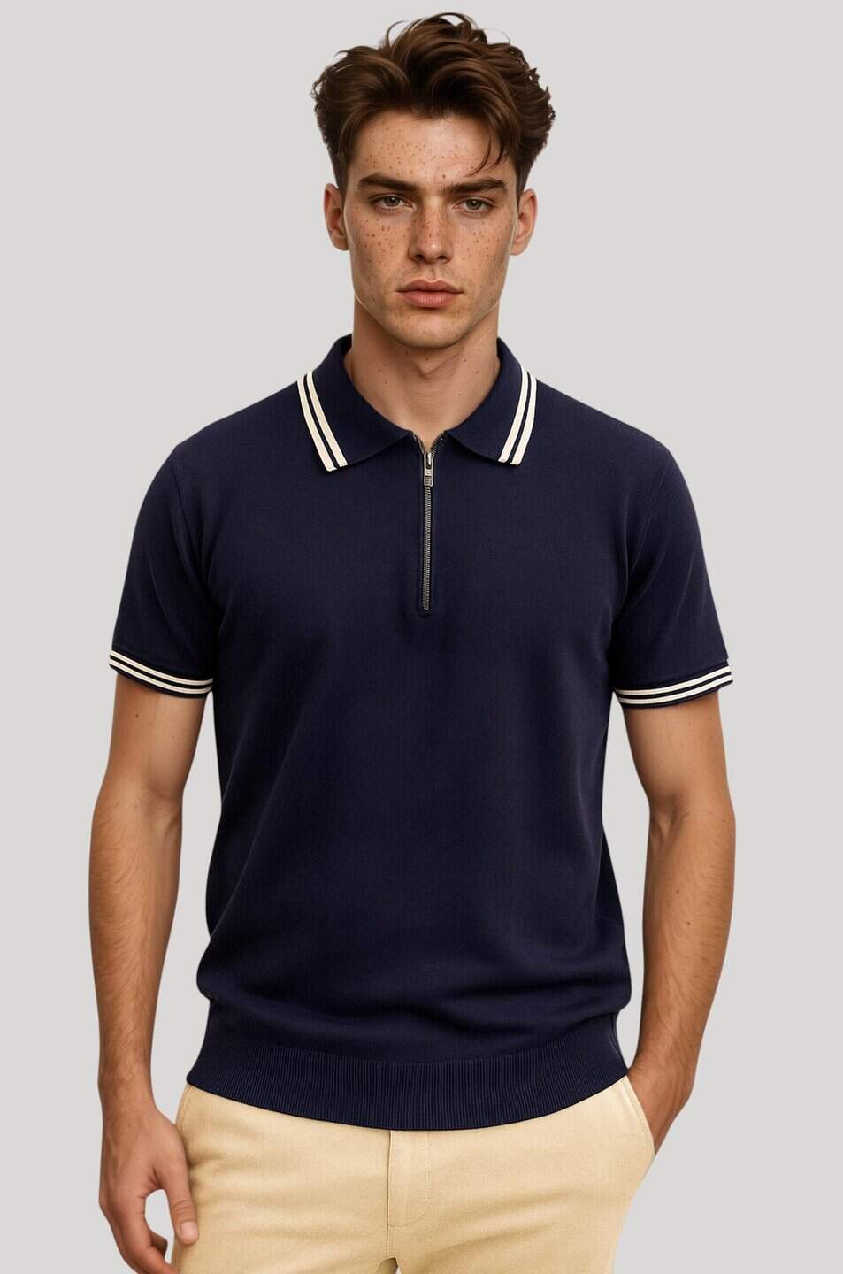 Chomba azul tejida Alex confeccionada en tejido suave y cómodo. Presenta cuello y mangas con vivos blancos que resaltan su estilo moderno y sofisticado. De calce regular, es una opción versátil ideal para looks casuales o más elegantes.