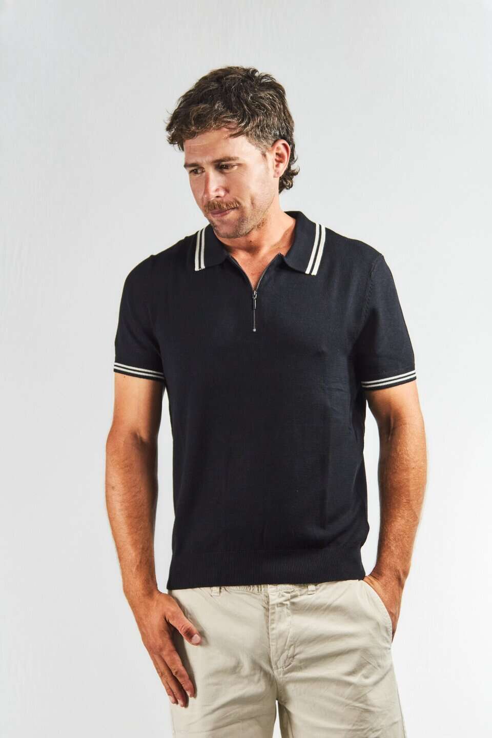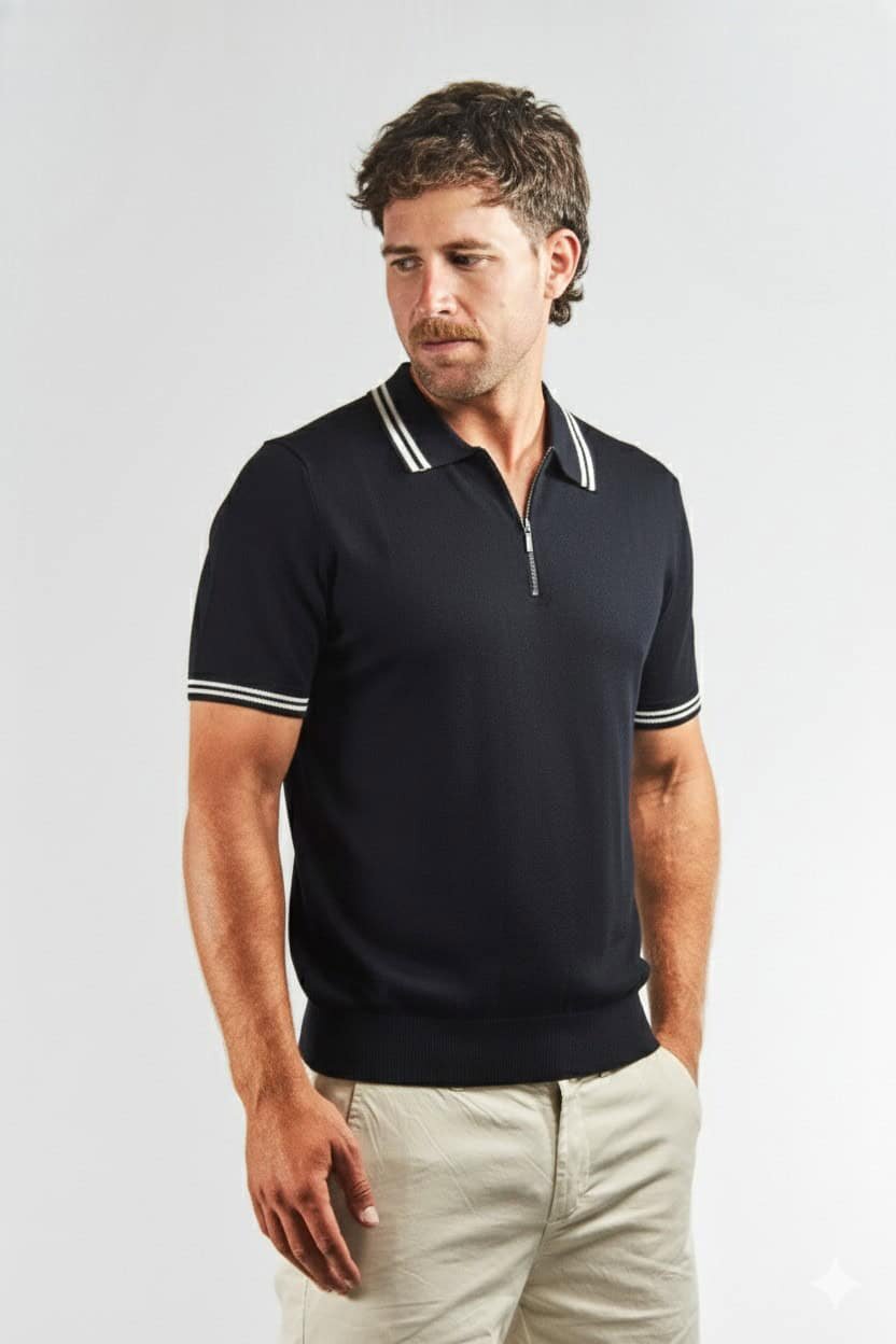 El cierre corto en el escote suma un detalle moderno y funcional, elevando el estilo clásico de la chomba tradicional.