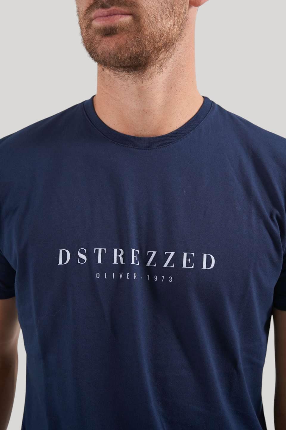 Remera de algodón azul marino modelo “DSTREZZED” con cuello redondo. Calidad jersey puro algodon 24/1 con logo estampado manga corta.