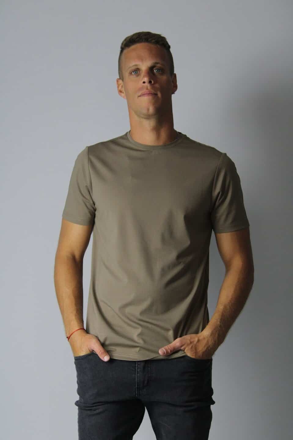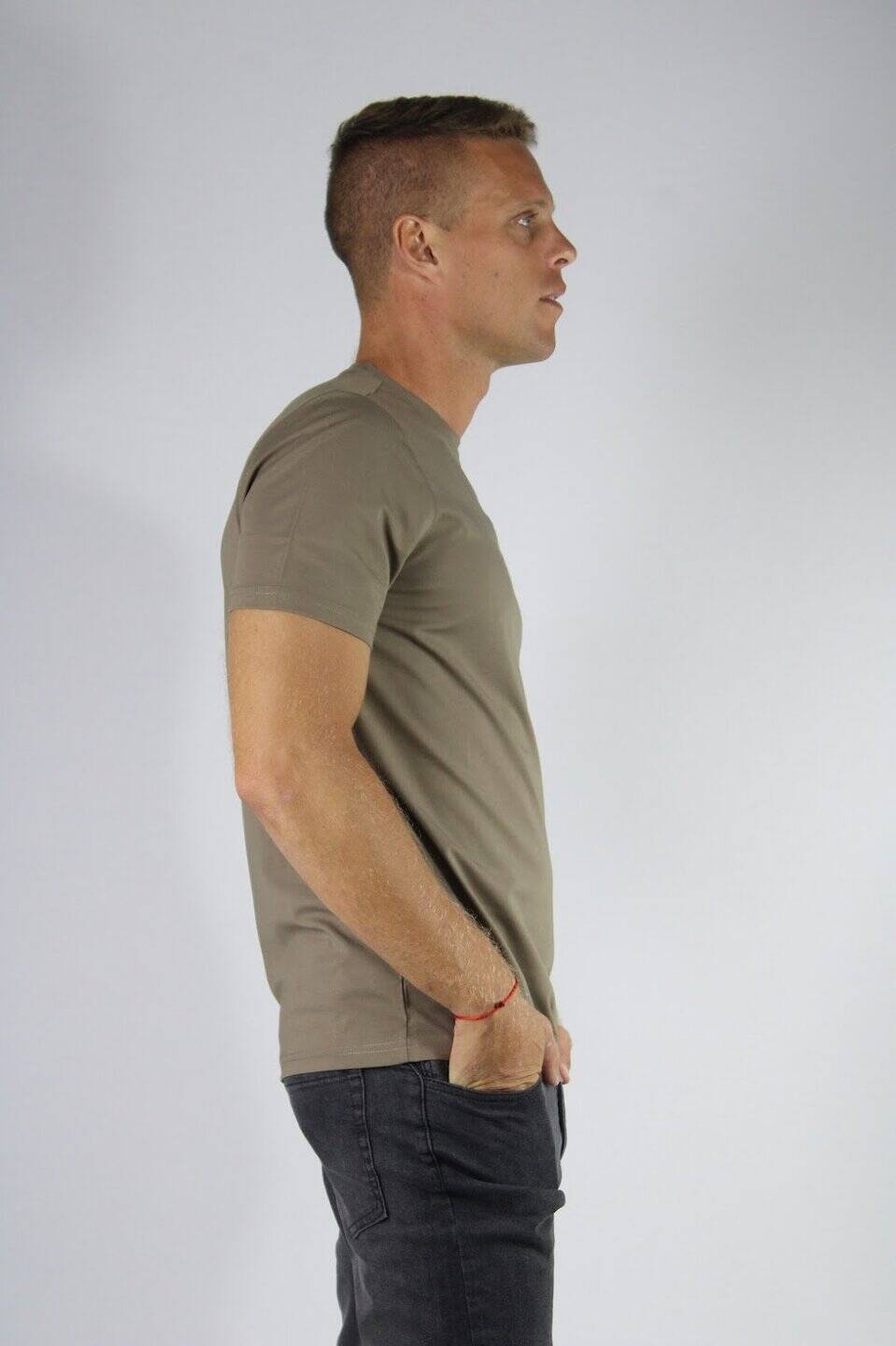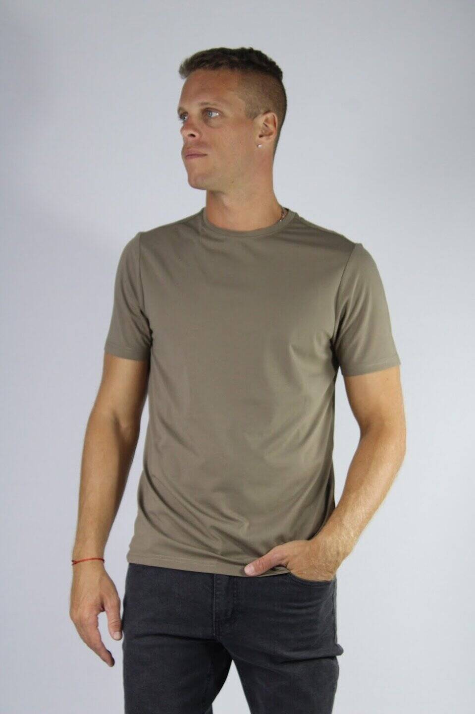 Remera tela premium modelo “Owen” en color visón lisa con cuello redondo.